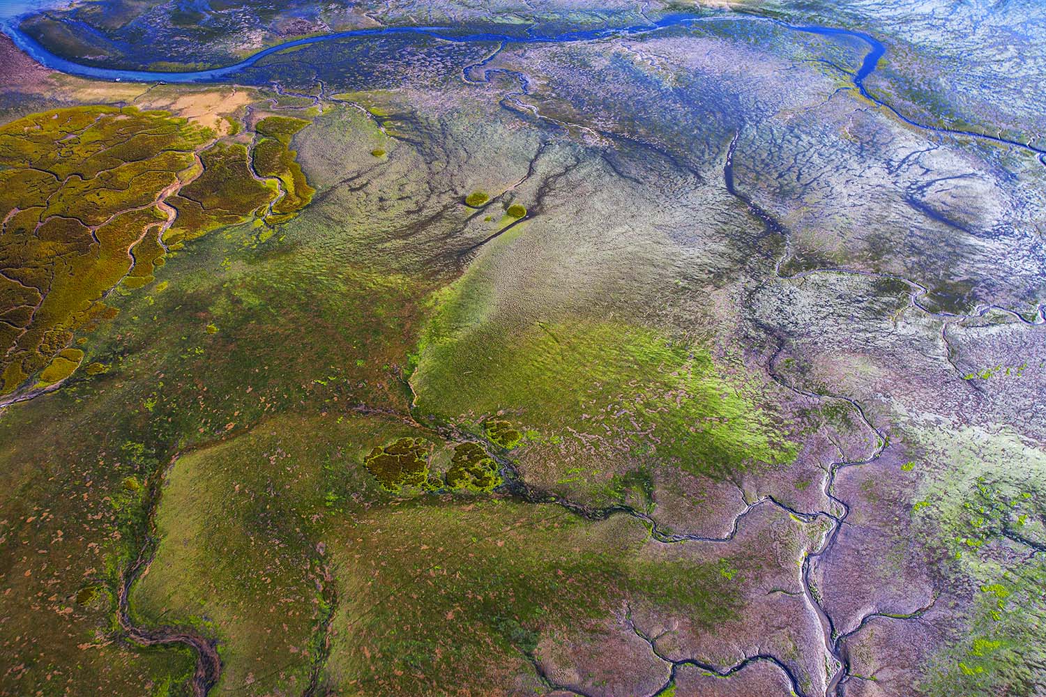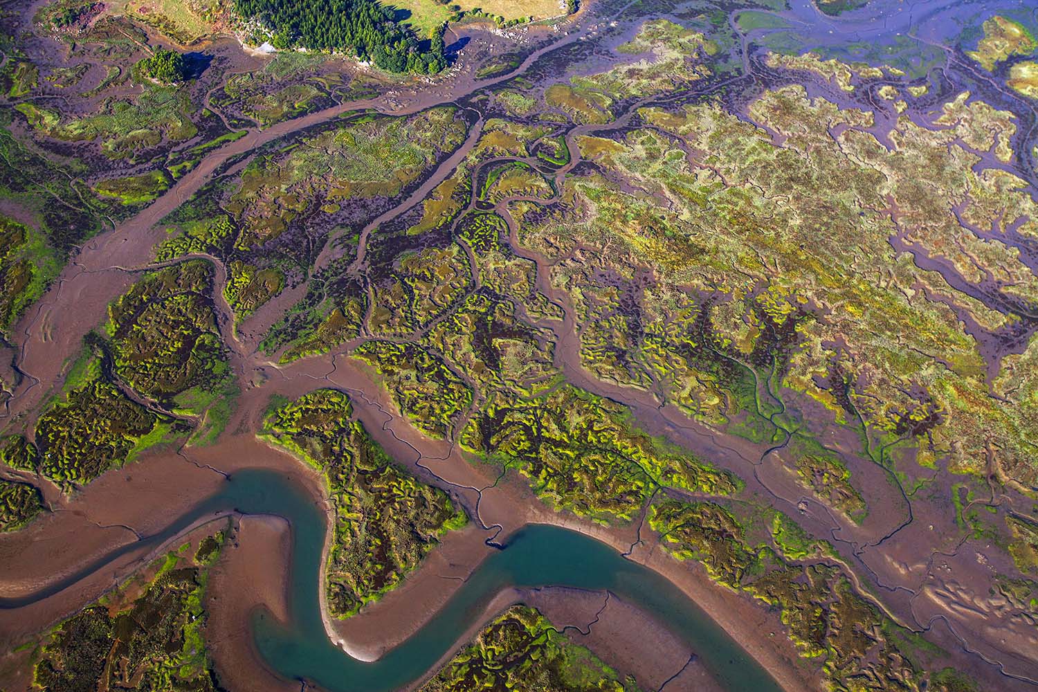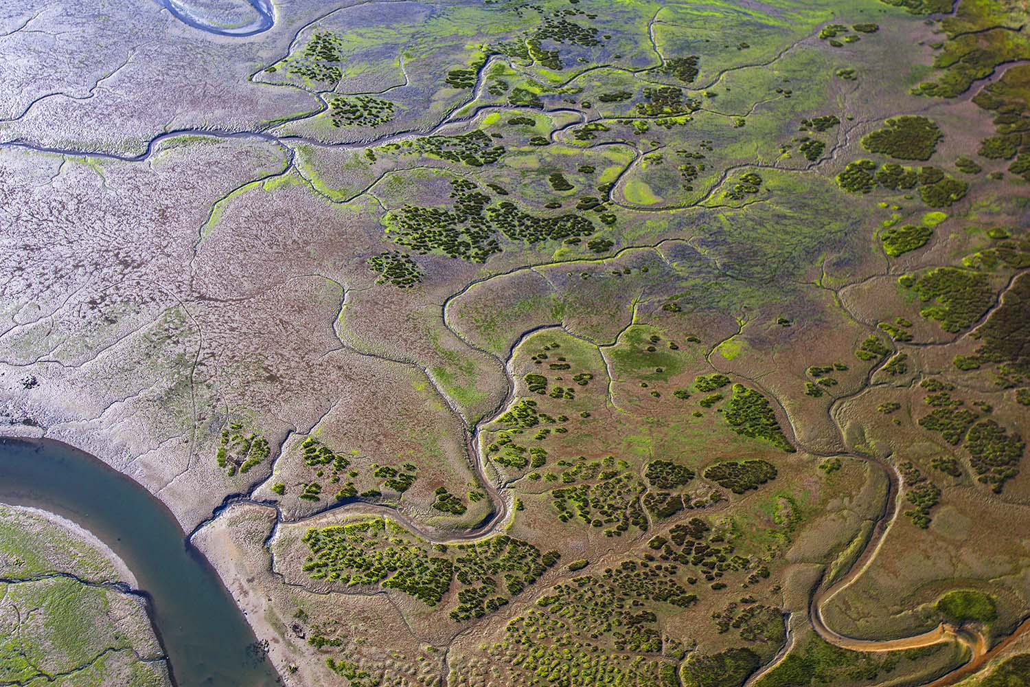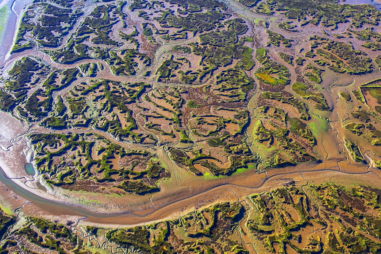 Sobrevolando rías y marismas en Cantabria, España, disfruto fotografiando paisajes de una belleza abstracta que me apasionan. Las estructuras fractales inundan las marismas cuando el agua desaparece tras la bajamar.