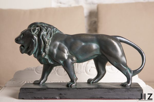 Reproducción antigua del famoso león del escultor francés del romanticismo Antoine Louis Barye del siglo XIX. Escultura en yeso pintada en bronce con una pátina espectacular por el paso del tiempo. Muy decorativa.