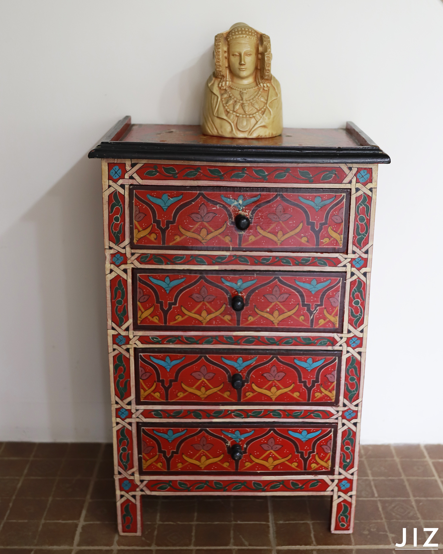 Precioso mueble muy decorativo fabricado en aromático cedro pintado a mano y traído hace años de Marruecos. La madera de cedro es de alta calidad además de poseer una sustancia que imposibilita la afectación de polilla o carcoma.